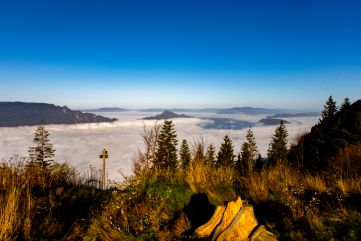Levé de soleil sur le Mont Granier, la ler de nuages à ses pieds recouvrant la vallée et s'échouant aux pieds des toures de Chignin.
